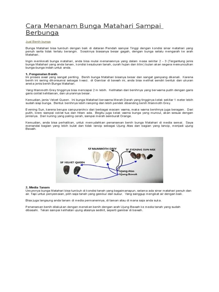 Warna benih putih bercorak garis hitam coklat dan berukuran besar; Dengan perawatan yang baik dan benar, jenis tumbuhan ini akan tumbuh dengan bagus dan elegan. Dinamakan mammoth karena ukuran bunganya Mudahnya menanam bunga matahari dari biji membuat pemula sekalipun dapat menanam benih bunga matahari dengan sukses. Langsung saja, yuk ikuti cara menanam bunga matahari di bawah ini! Dan ukuran aneka jenis benih bunga matahari. Mammoth, jenis bunga ini memiliki diameter saat mekar 30 cm . Benih memiliki ukuran yang lebih kecil. Jenis yang paling besar dengan diameter bunga ketika mekar mencapai 30 cm. Cara menanam bunga matahari paling lengkap untuk pemula,. Cara mudah menanam bunga matahari di . Ada empat kelompok budidaya bagi bunga matahari yang. Beli produk bibit bunga matahari berkualitas dengan harga murah dari berbagai pelapak di.